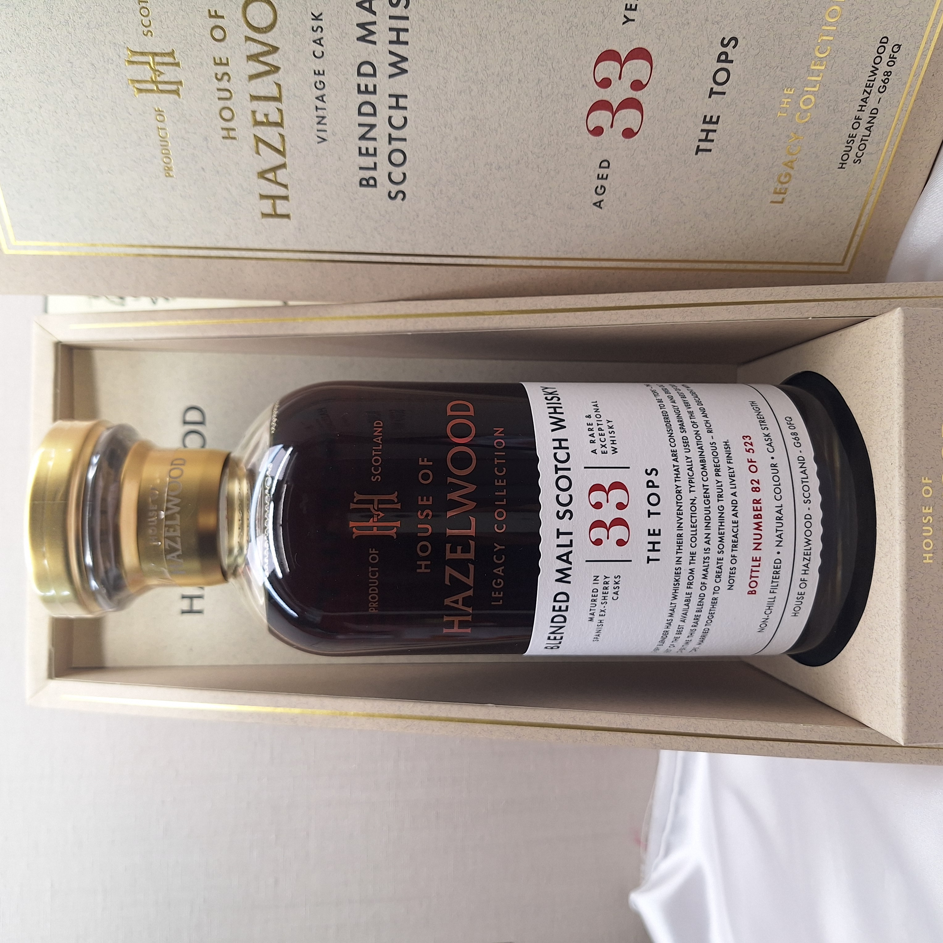 ブレンダーが最高の品質と考える樽を貯蔵庫から選び出して造った「トップ」クラスのブレンデッドモルト。ファーストフィル&リフィルシェリーのスパニッシュオーク樽で33年間熟成。色は濃いウォールナット、香りは優雅で甘く、糖蜜やトフィーにキャラメル、味は最初甘くドライなオークで最後に甘いシャーベット。