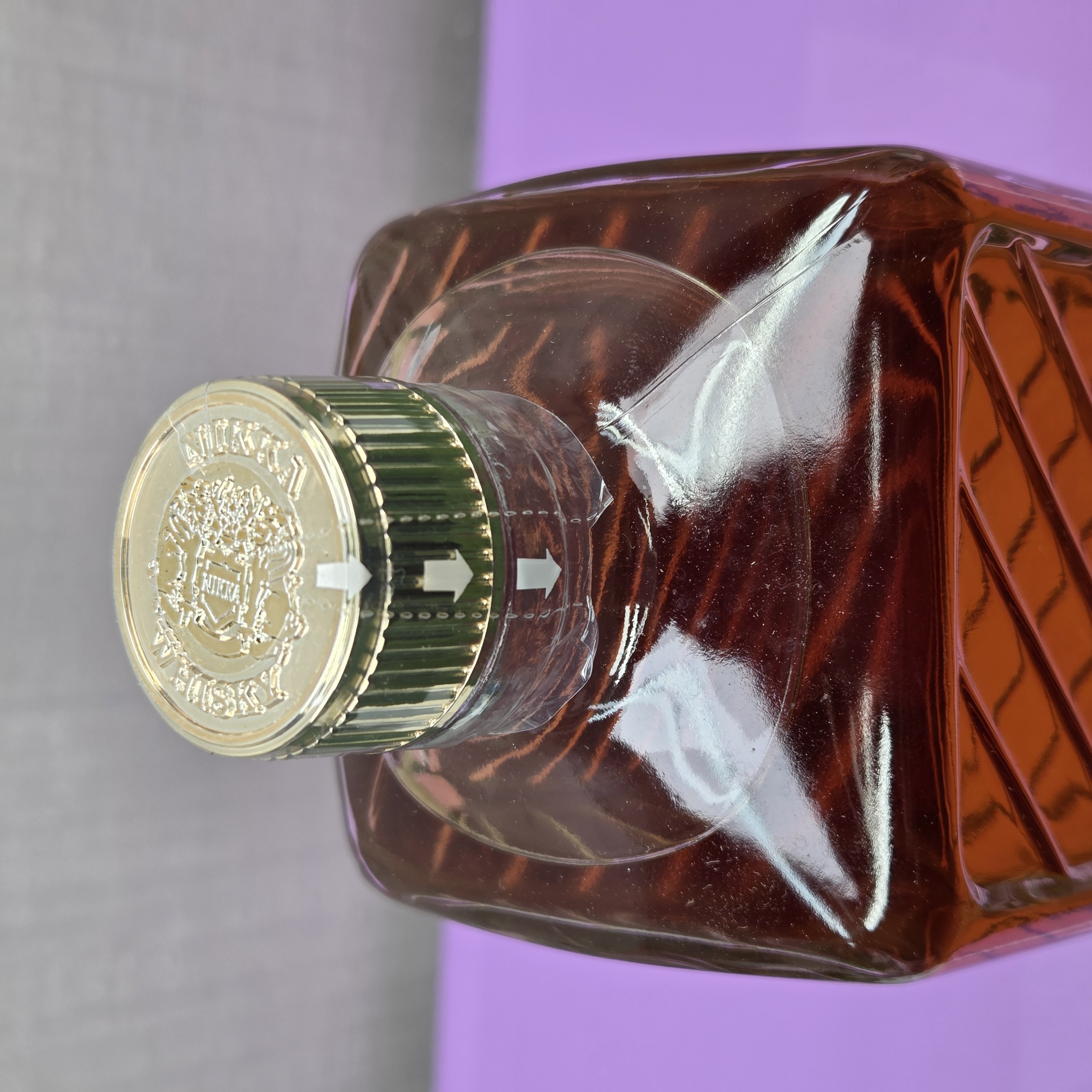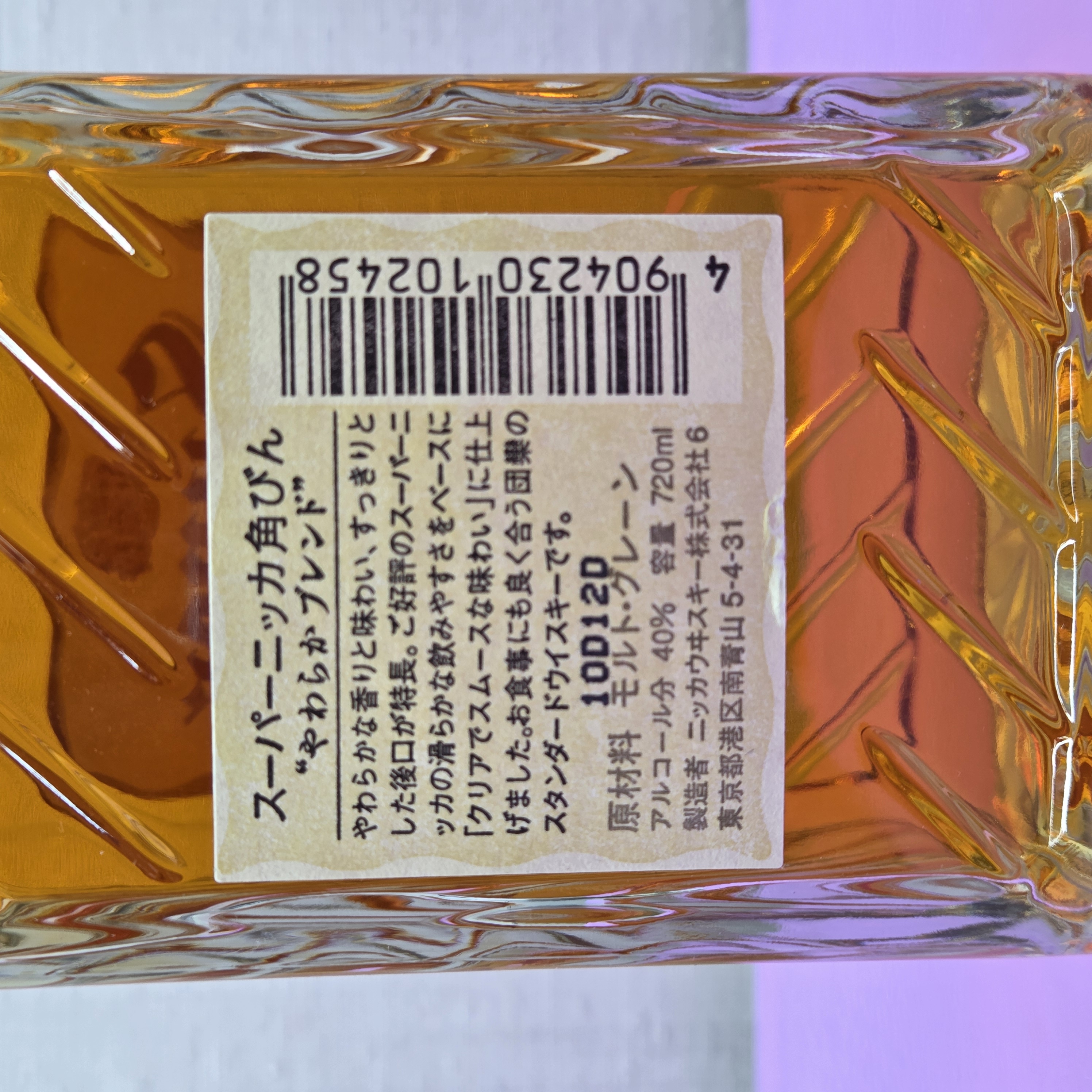 ボトルは、ニッカウヰスキーの第一号のような、格子模様の入った透明な角瓶が使用されています。