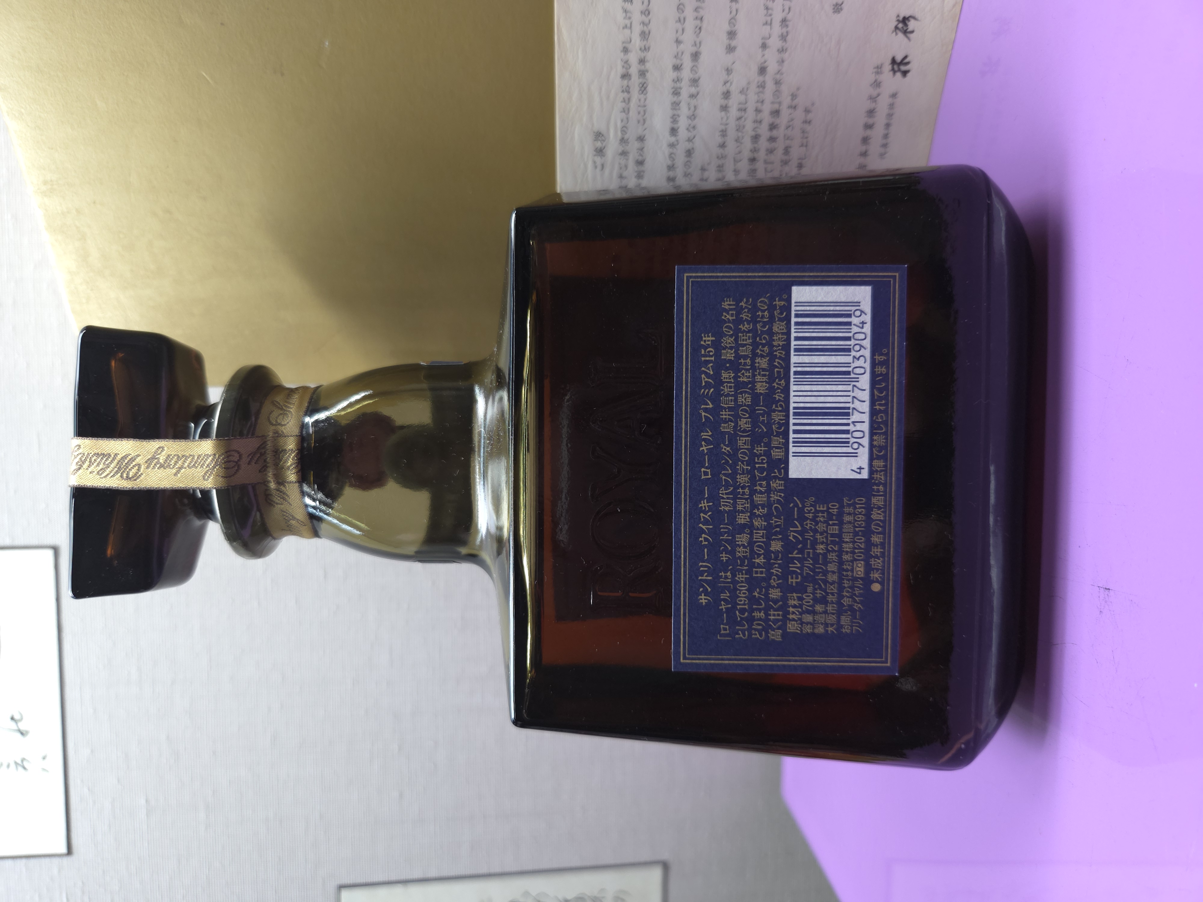 「ローヤル」は、サントリー初代ブレンダー鳥井信治郎・最後の名作として1960年に登場。瓶型は漢字の酉(酒の器)、栓は鳥居をかたどりました。日本の四季を重ねて15年。シェリー樽貯蔵ならではの、高く甘く華やかに舞い立つ芳香と、重厚で滑らかなコクが特徴です。・・・バックラベルより抜粋。